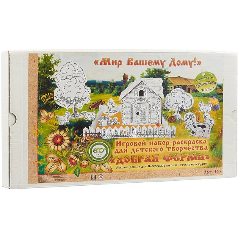 Вы держите в руках игрушку-раскраску, сделанную из картона, и называется она 'Добрая Ферма'! Это самая настоящая ферма с домиком, деревьями, умной сторожевой собачкой, хитрым котиком на крыше, который очень любит греться на солнышке. Как и полагается на ферме у нас есть настоящее хозяйство - коровка, которая дает вкусное молоко, веселый поросенок и задорная коза-дереза. Соберите домик, постройте вокруг домика забор, посадите деревья и заведите домашних животных. Ну а потом, это все можно раскрасить красками и аккуратно, ведь это ваша ферма!