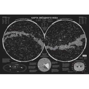 Звёзды на карте ранжированы по видимой звёздной величине. Даны названия самых ярких звёзд и условные очертания всех 88 созвездий. Приведёны краткие сведения о Солнечной системе, небесной сфере, звёздных координатах, эклиптике и зодиакальном круге. Карта может быть рекомендована всем, кто интересуется астрономией и любит романтику. Карта упакована в прозрачный тубус (пакет с объёмным дном и еврослотом) из мягкого пластика.